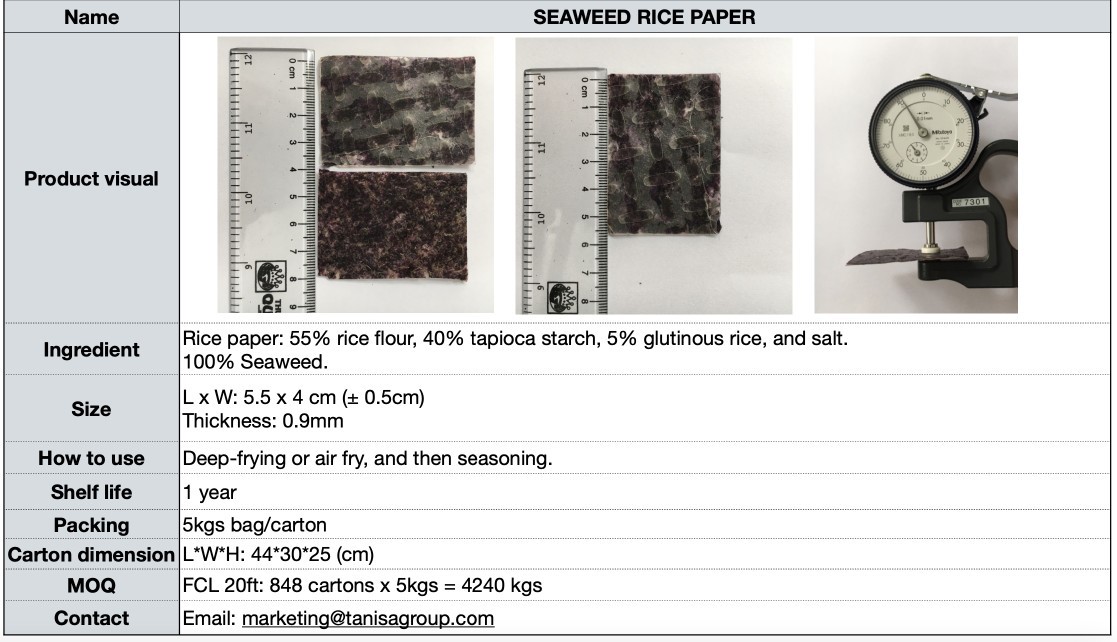 TANISA FOODS JSC, a strong brand in the market for the production and distribution of specialty products (rice paper, rice noodles...) and spices (seasoning) which exported to some countries such as USA, France, South Korea, Japan, Russia, Brunei...