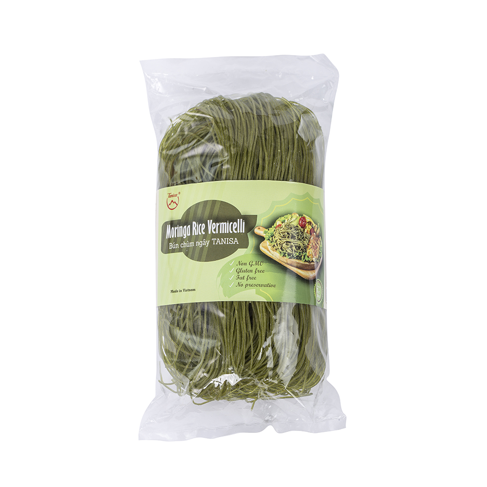 Moringa vermicelli is a superfood variation of rice vermicelli made with moringa leaf powder. Moringa leaves are known for their high nutritional value, containing vitamins and minerals such as calcium, iron, and protein. At Company TANISA, we take pride in our reputation as a reliable and reputable manufacturer, supplier, and distributor of rice paper products. Our commitment to quality is unparalleled, ensuring that every sheet of rice paper that leaves our facilities is of the highest standard. And Experienced in exporting to more than 30 countries. We always source our rice from the lush fields of Vietnam, renowned for producing some of the world's finest rice varieties. With meticulous care and attention to detail, we transform this raw material into the exceptional rice paper that graces your culinary endeavors. Moringa vermicelli caters to diverse dietary preferences, making it a popular choice among individuals with varying needs. Our commitment to crafting a product that's not only delicious but also halal and FDA-approved ensures that it's accessible and enjoyed by a global audience.