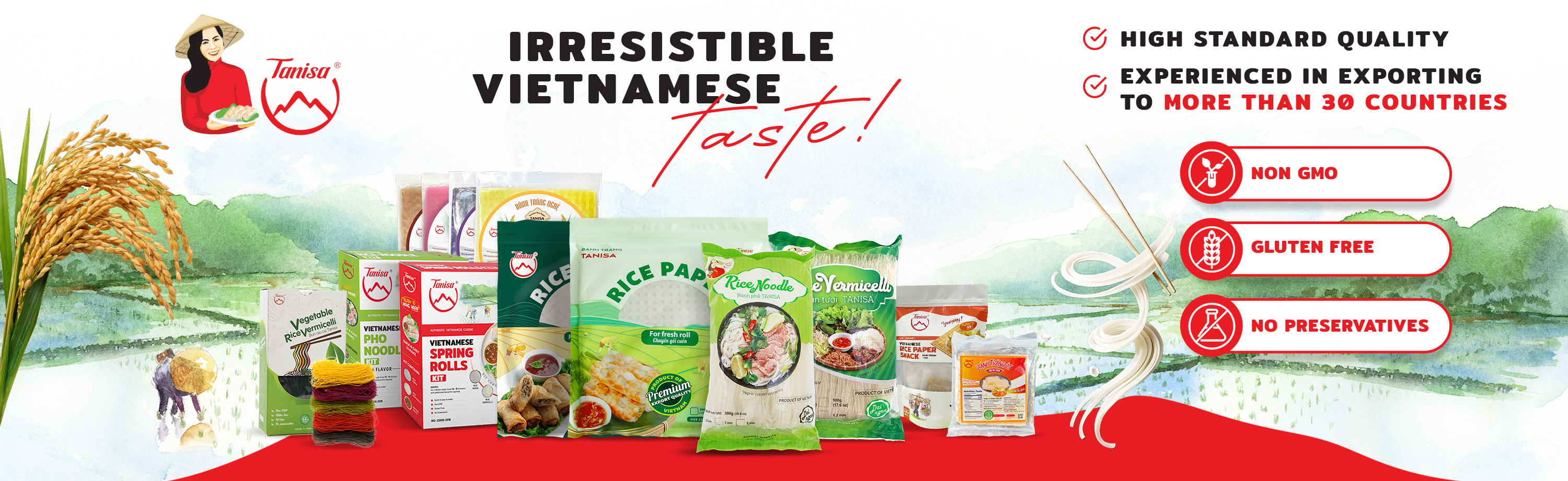 TANISA FOODS JSC, a strong brand in the market for the production and distribution of specialty products (rice paper, rice noodles...) and spices (seasoning) which exported to some countries such as USA, France, South Korea, Japan, Russia, Brunei...